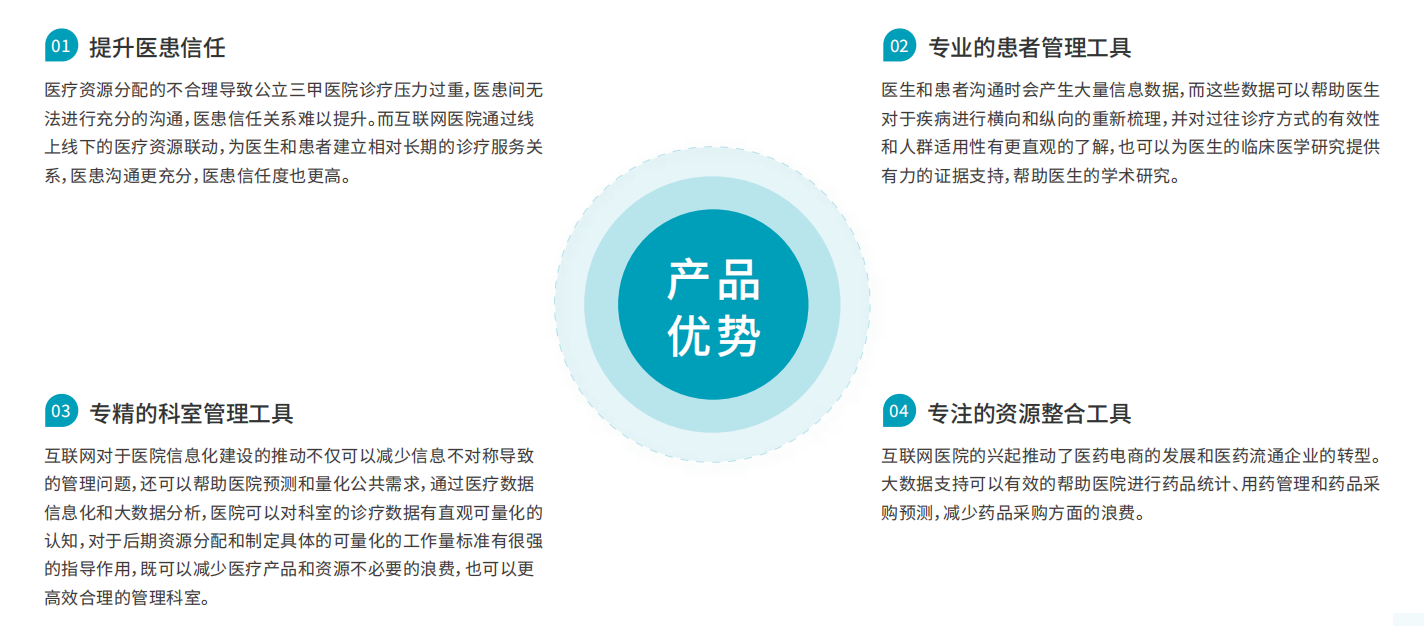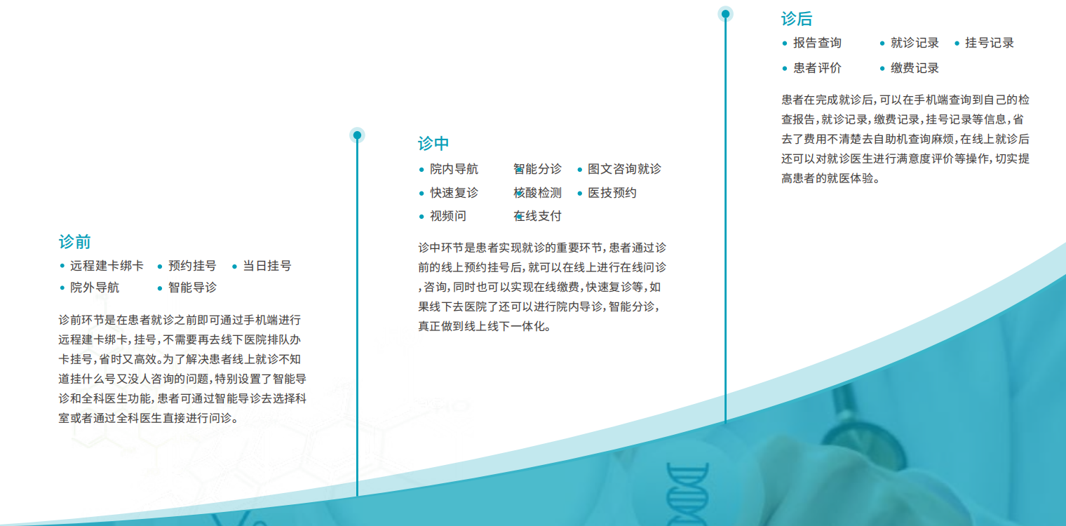构建“医疗、服务、管理,三位一体的互联网医疗服务平台”,发挥联网医院高效、便捷、个性化等优势,打通院内院外的医疗资源、患者数据、整合线上线下业务,为患者提供在线支付、线上排队、视频问诊、电子处方、在线购药等服务项目,为医院重构并优化移动互联网时代的新型医疗服务流程,赋予未来医院发展的核心能力。
