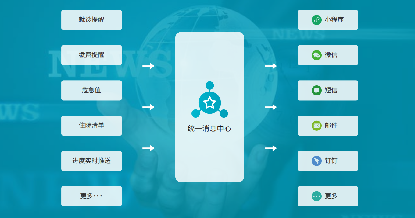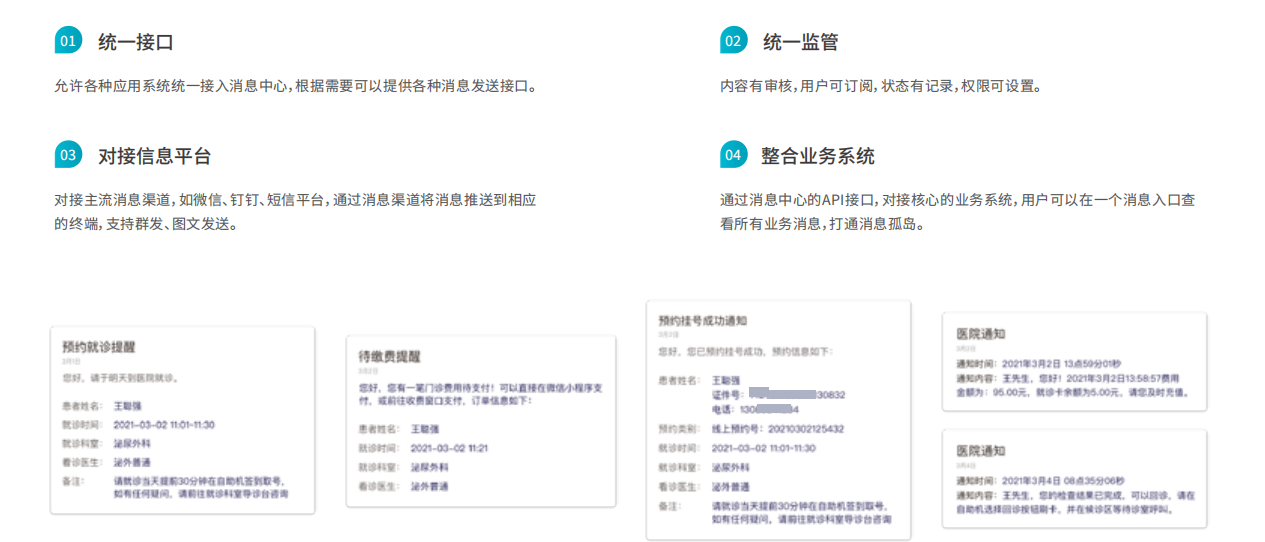 核心功能:将各业务部门的消息,如患者就诊提醒、缴费提醒,住院清单,实施进度等,通过统一消息中心整合起来再通过多种消息渠道推送到相应的终端。使用户能及时准确的掌握自己的各项信息,增加用户体验感。